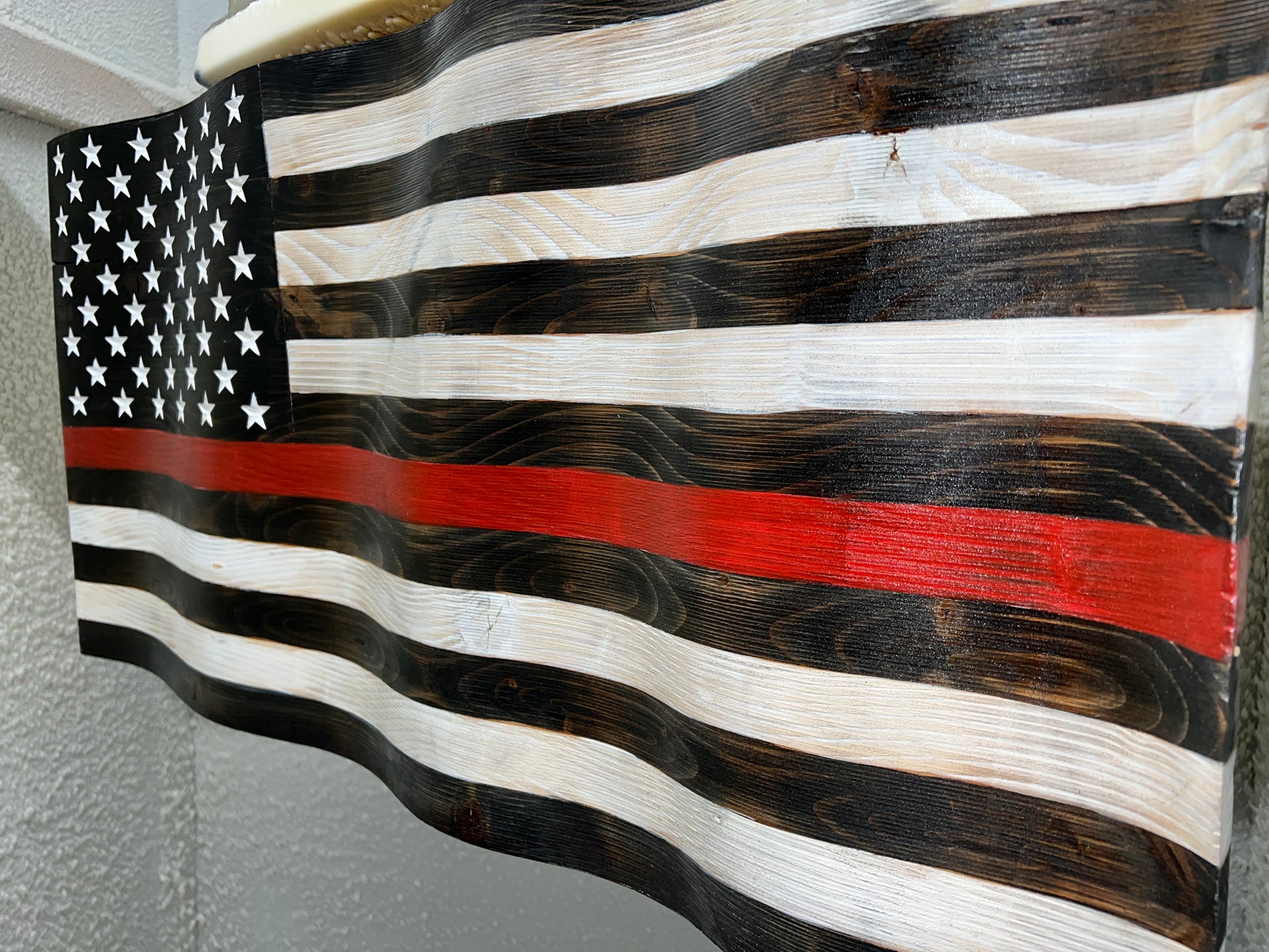 Using a variety of hand tools each 2″ x 4″ plank of solid wood is engraved down, giving the three dimensional waves their unique appearance. Then the flag is hand painted and finished with the best quality materials. Each Custom Jack is individually numbered in it’s series.